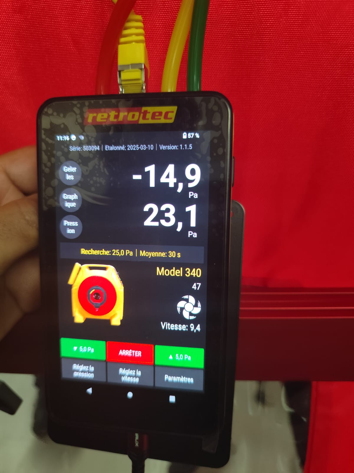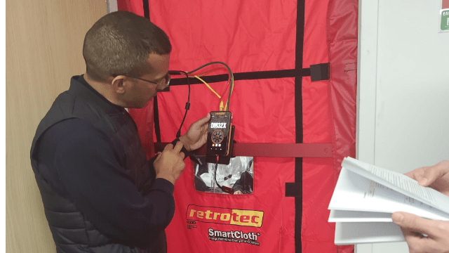Un ventilateur calibré met le bâtiment en dépression, ce qui permet de quantifier les déperditions d’air parasites, de localiser les fuites avec une caméra thermique et un anémomètre et de calculer des indicateurs clés comme l’indice n50 ou le Q4Pa.