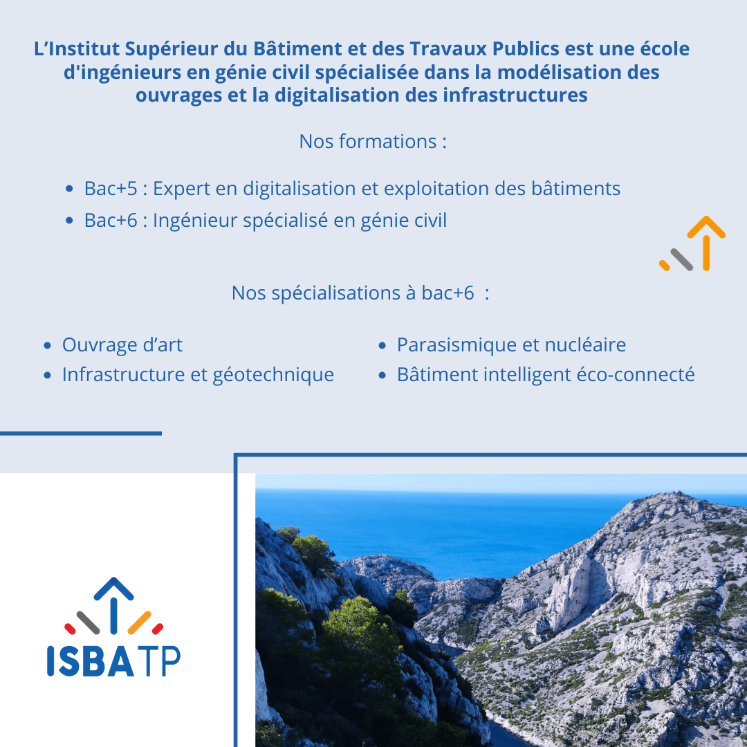 L’ISBA TP (Institut Supérieur du Bâtiment et des Travaux Publics) propose des formations spécialisées en BIM, adaptées aux besoins du secteur des TP. Nos programmes couvrent les aspects techniques, réglementaires et managériaux du BIM, afin de former des professionnels compétents et opérationnels.